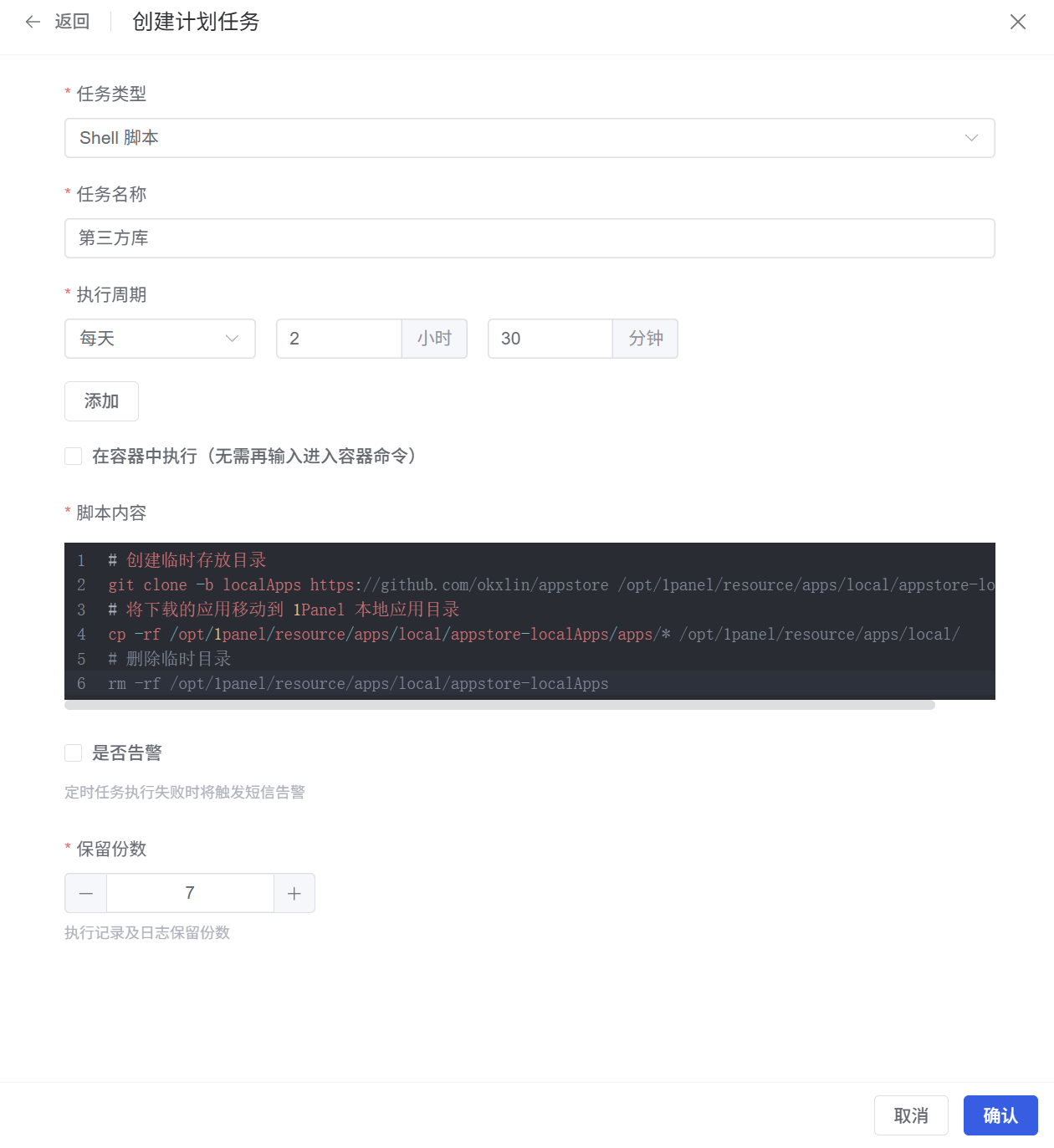 rm -rf /opt/1panel/resource/apps/local/appstore-localApps任务名称随意,执行周期按照自己的情况来